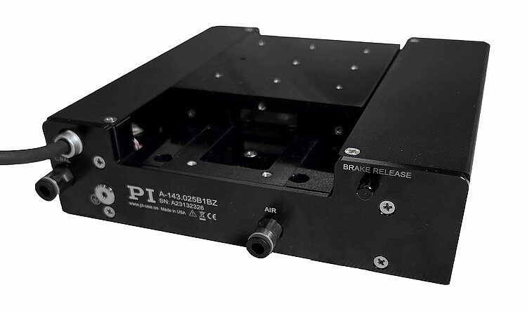 PIglide miniature linear stage with air bearings; ironless 3-phase linear motor; 25 mm travel range; 40 N load capacity; 390 mm/s maximum velocity; absolute linear encoder, 1 nm sensor resolution, BiSS-C; 0.5 m cable length; emergency brake; pneumatic counterbalance
