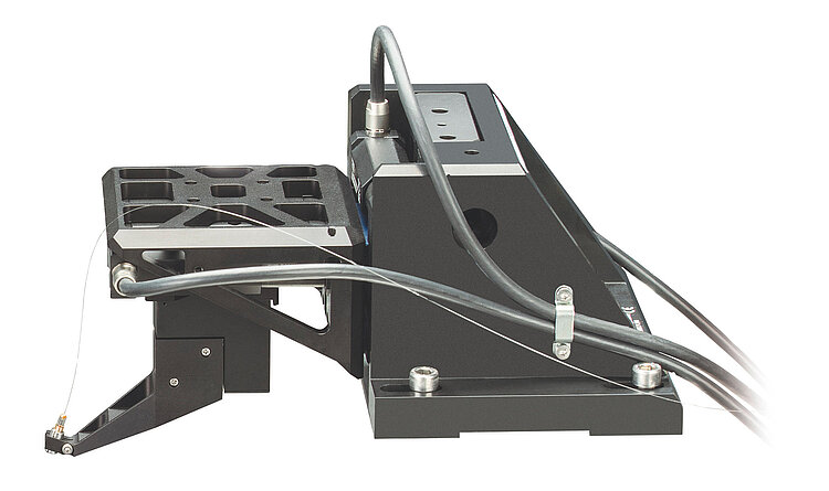 This compact solution integrates a high-precision XYZ stage (based on model M-122) for generous travel with an XYZ piezo nanopositioner of extraordinary speed and resolution (based on model P-616). A single controller manages all axes in single-sided and double-sided configurations: F-713.MA1 and F-713.MA2. Four high-resolution analog inputs provide connectivity to power meters, such as PI’s F-712.PM1 high-bandwidth optical power meter, for optimization and profiling, enabling efficient and fast automated fiber alignment. Soft limits are supported to ensure process safety. Starting with these sophisticated platforms, it is easy to configure automated alignment solutions of unprecedented speed that support functionalities such as submicron-sensitive wafer proximity automation.