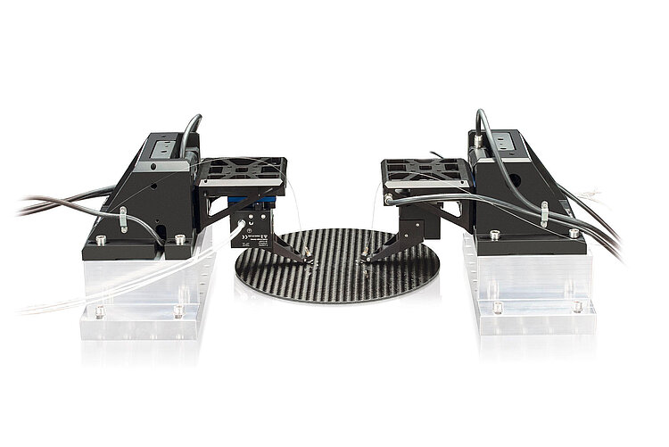 Double-sided photonics alignment system consisting of stacked XYZ linear positioners and 2 NanoCube® nanopositioners; E-713 digital controller with 4 analog inputs; firmware routines for high-speed alignment tasks; software package