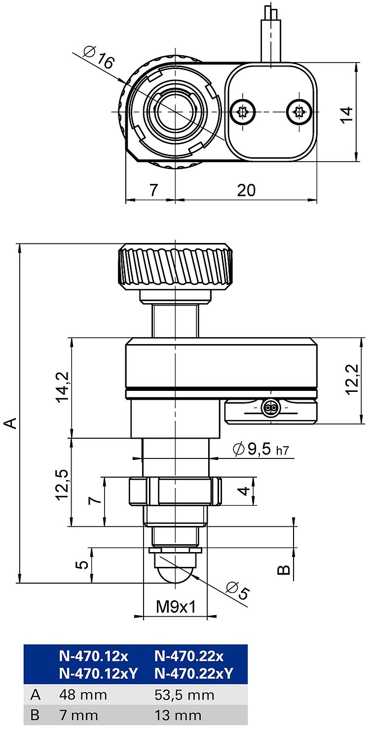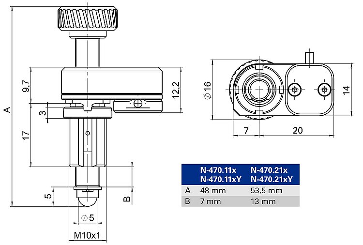 PiezoMike linear actuator; piezoelectric inertia drive; 7 mm travel range; M10×1 thread; 22 N feed force; 2.4 mm/min maximum velocity; 2 m cable length; turned cable exit