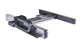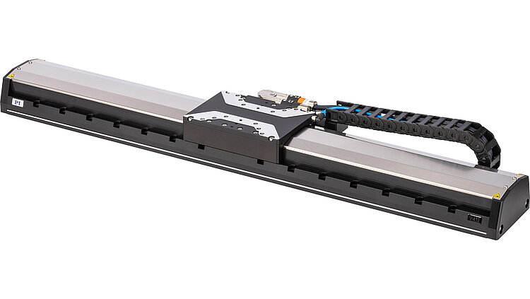 High-load linear stage; ironless 3-phase linear motor; 407 mm travel range; 400 N load capacity; 2000 mm/s maximum velocity; incremental linear encoder, 20 µm signal period, sin/cos, 1 V peak-peak; drag chain