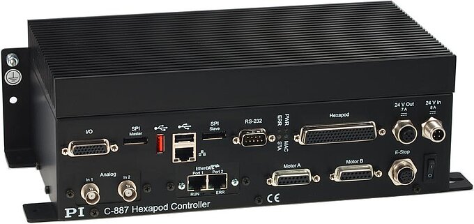 The hexapod controller provides simple and intuitive control of parallel-kinematic 6DoF systems: All target positions can be commanded in Cartesian coordinates. The controller performs the calculations for controlling the individual struts and the resulting desired movement of the platform.