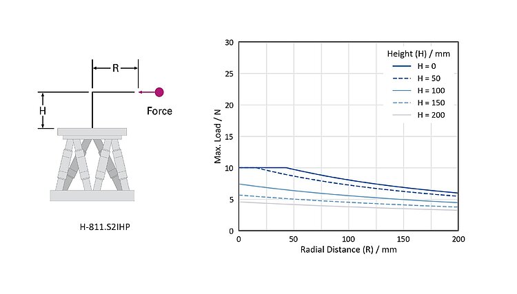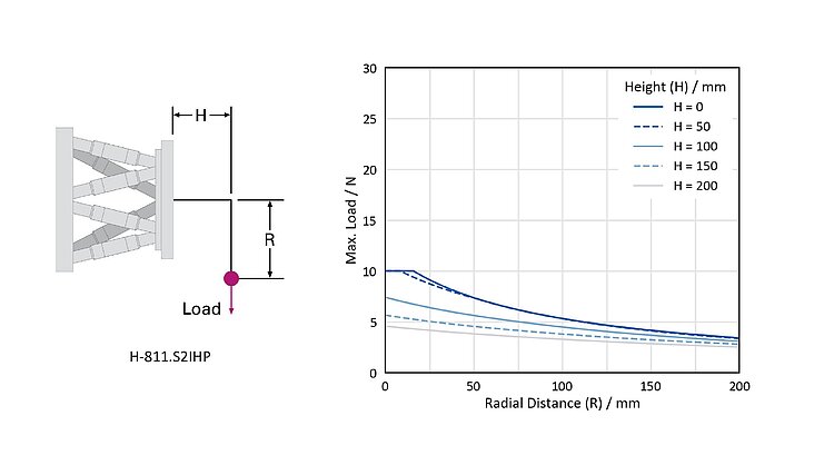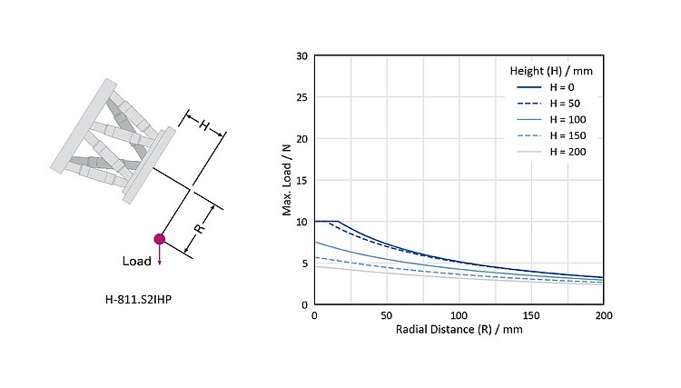 The PIVirtualMove software, which can be downloaded free of charge, simulates the travel range, the alignment, and the permissible forces and torques of the H-811 to facilitate an optimum system configuration. In this context, both the chosen center of rotation and the center of gravity of the load are taken into consideration.