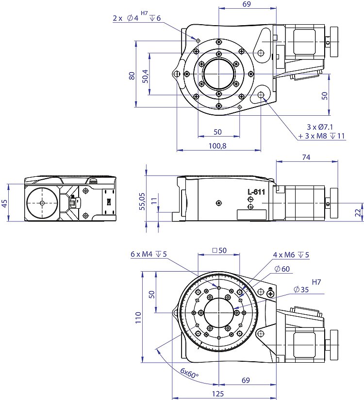 High-precision positioning due to low-play preloaded worm gear. Preloaded pivot bearings for high run-out accuracy. Clear aperture with 35 mm Ø. Unlimited travel range in both directions of rotation. Noncontact reference switch. Compact multi-axis positioning systems possible with L-511 linear stages and L-310 Z stages. Vacuum-compatible product variants on request.