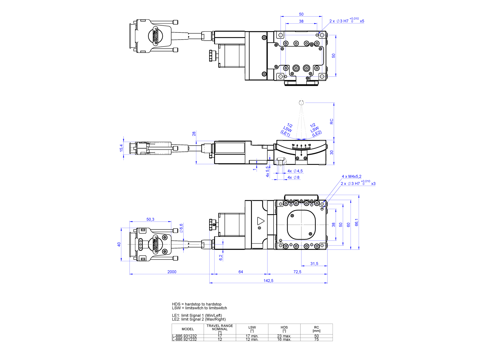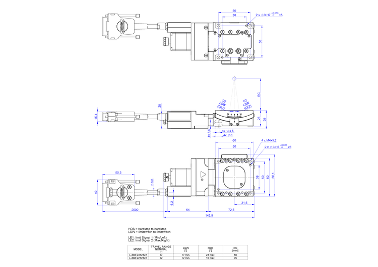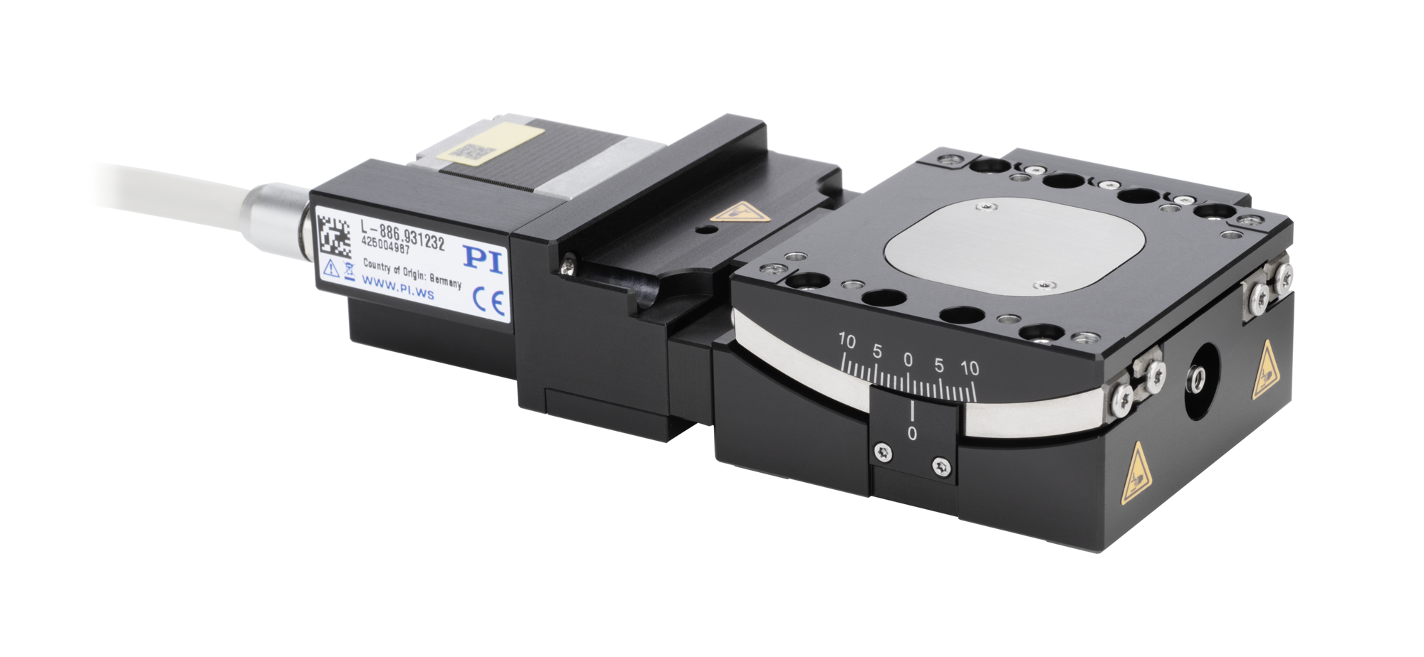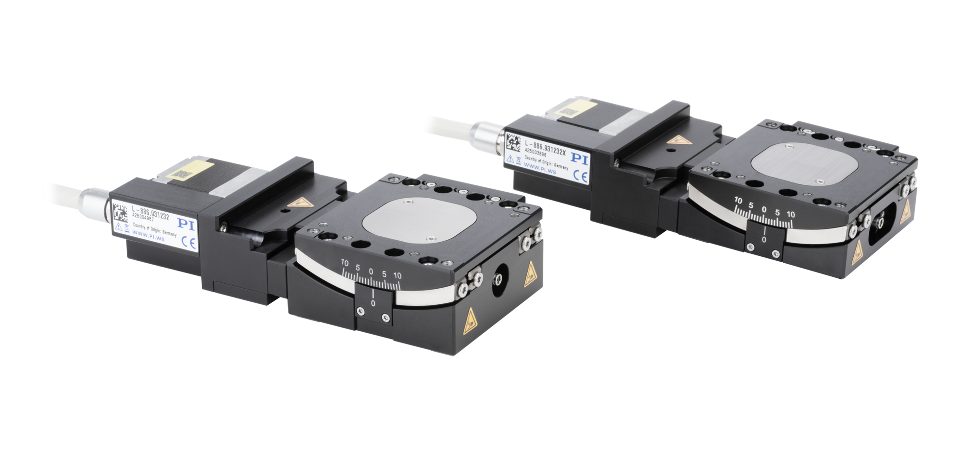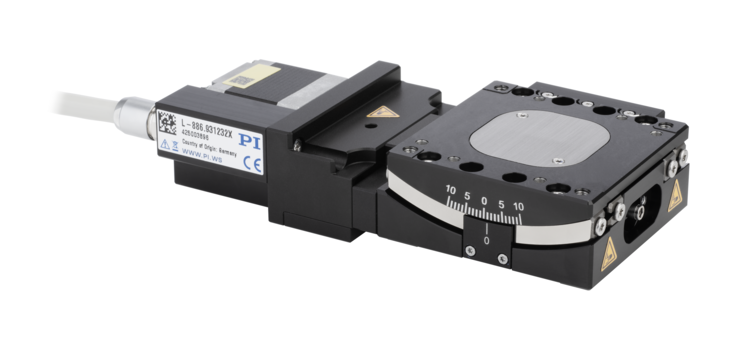 The goniometers can be mounted onto L-836 linear stages. The L-886 models are stackable for 2-axis motion. If an L-886.931232X is mounted onto an L-886.921232[X], the models will have a common center of rotation.