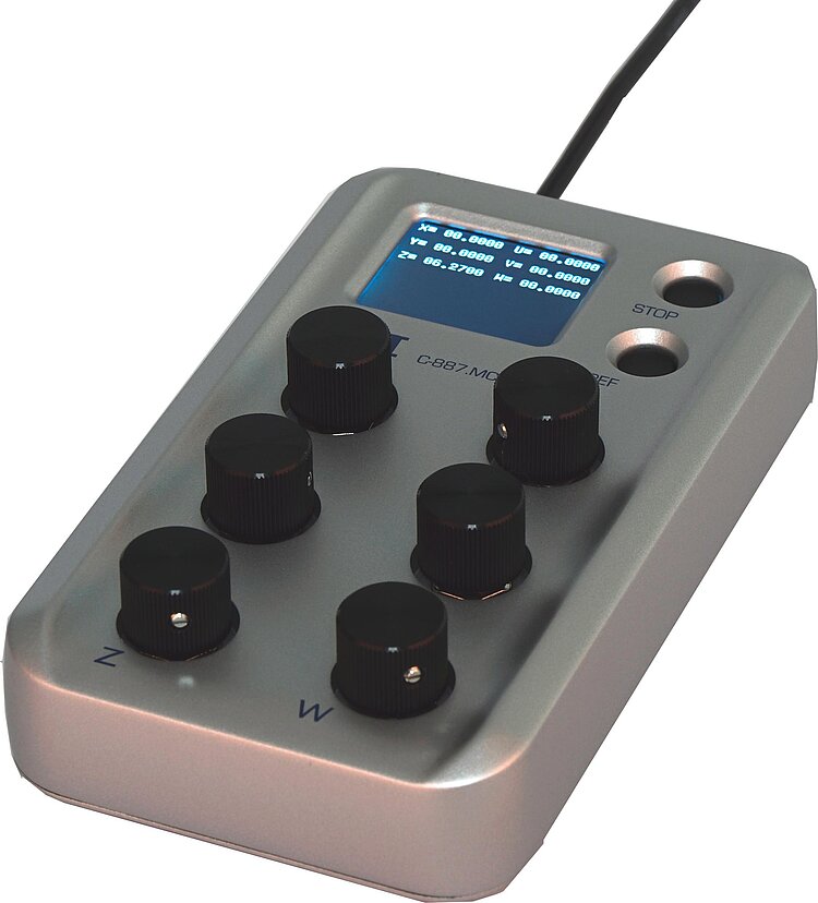 Using the C-887.MC2 manual control unit, axis motion can be started and stopped. For this purpose, C-887.MC2 is connected either to a C-887.5xx[0] hexapod controller or to a PC.