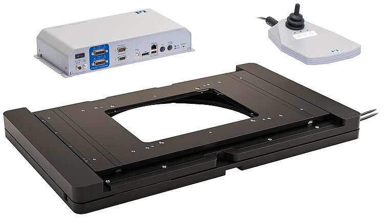 System consisting of U-781.NOZL XY stage, controller, and USB joystick. Large clear aperture 160 mm × 110 mm.